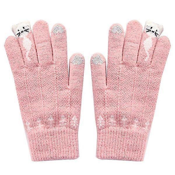 Winter Women Cute Cartoon Cats Touch Screen Gloves Full Finger Knitted Mittens Pink