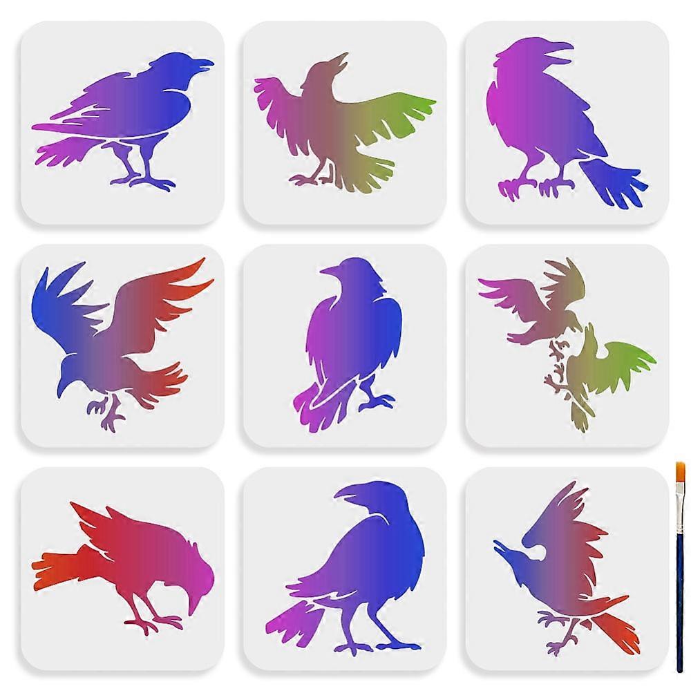 1Bag 9pcs Crow Stencils 6×6inch with Paint Brush, compatible with Halloween Birds Decor, for Wood, Wall, Fabric, Paper & Furniture