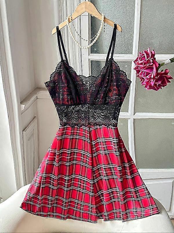 ��Plus Size�� Plaid Patchwork Print Contrast Lace Cami Nightdress, Casual Soft Comfortable Spaghetti Strap Nightgown for Women, Women's Sleepw