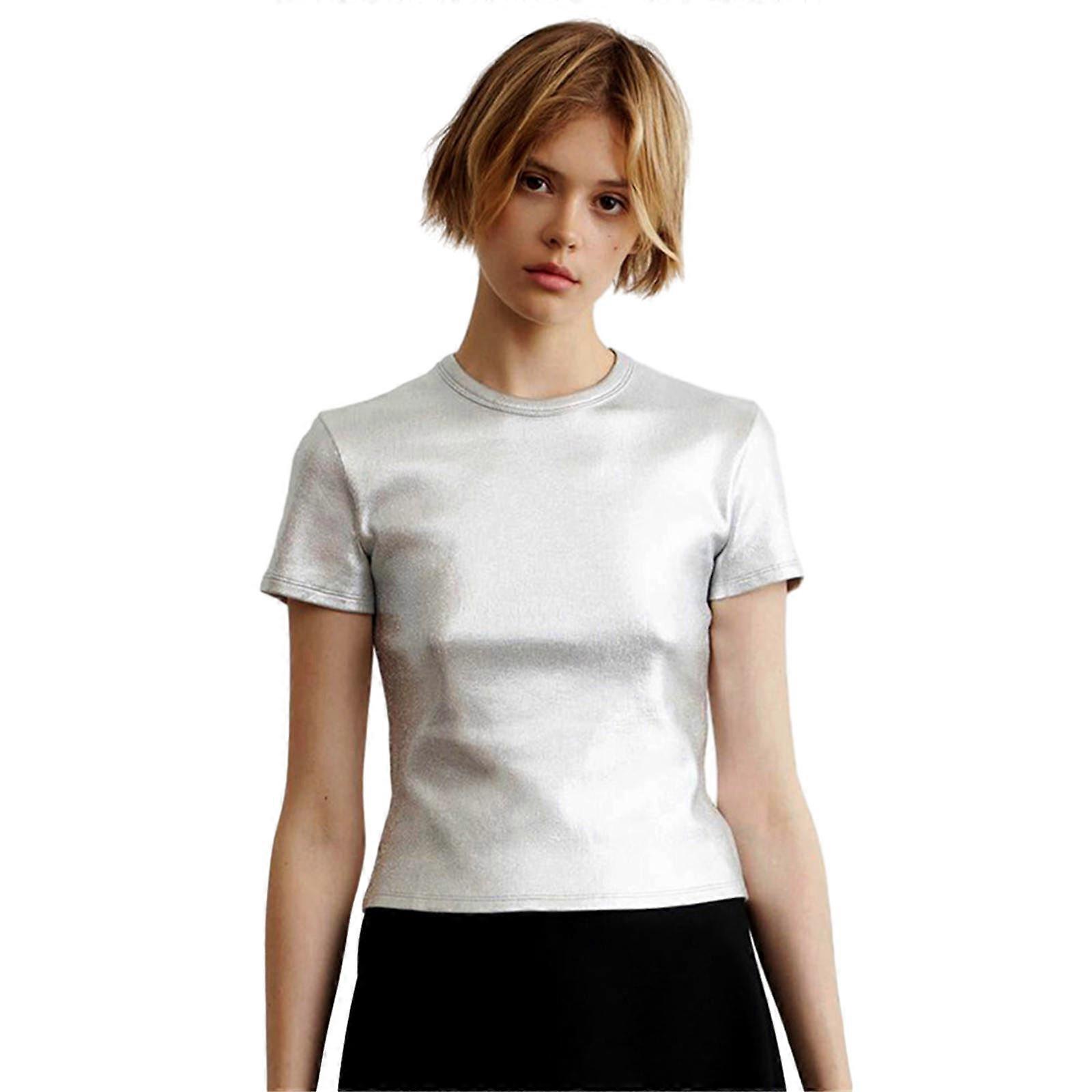 Fashionable Women's Casual Round Neck Crop Tops Summer T Shirt Short Sleeves Tee Silver S