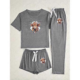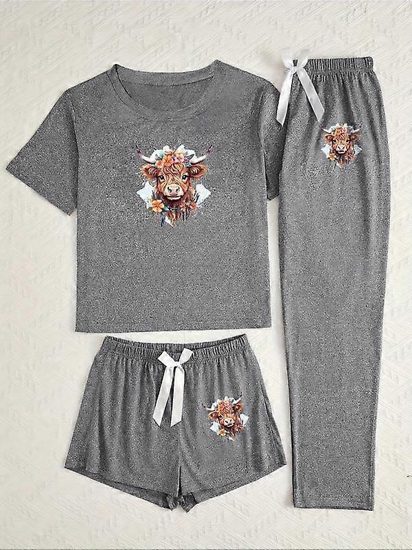 Women's Cartoon Highland Cow Print Round Neck Short Sleeve Top & Bow Waist Shorts Set, Casual Comfortable Home Wear for All Seasons