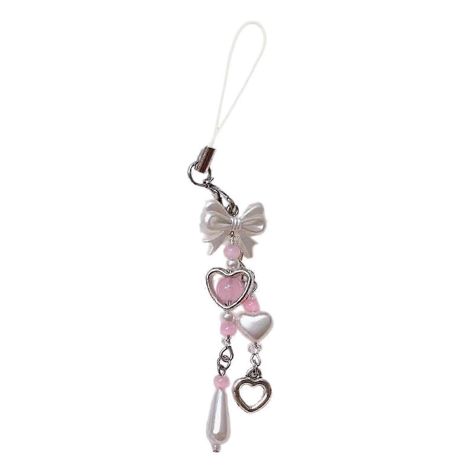 Exquisite Sweet Bowknot Phone Chain Ornament Heart Beaded Cellphone Pendant Phone Lanyard Bag Ornament for Fashion Individuals
