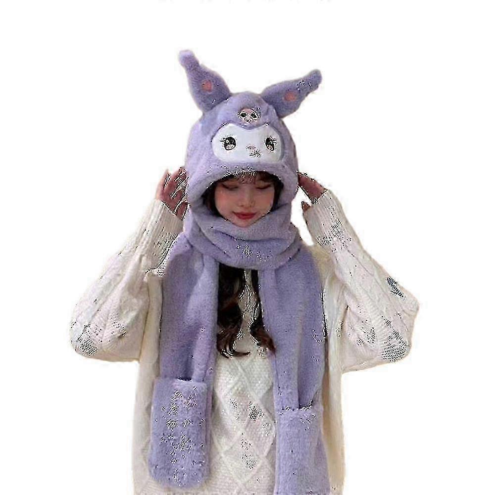 w Lady Girls 3 In 1 Kawaii Kuromi Plush Hat With Scarf Gloves Winter Outdoor Warm Gifts