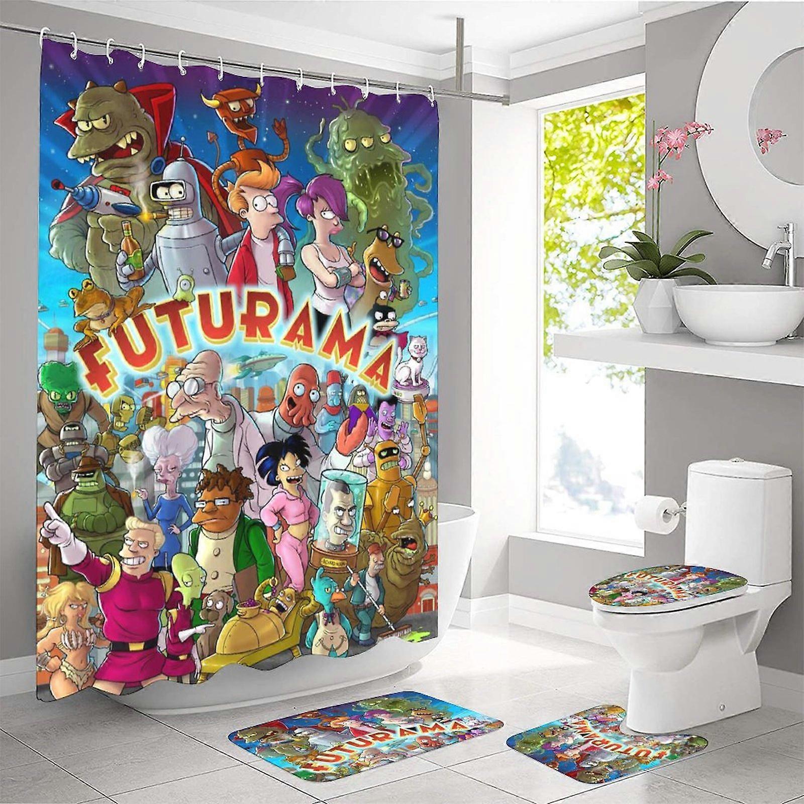 4PC FutuRama Shower Set w/ NonSlip Rug, Toilet Cover & Bath Mat, Waterproof Curtain + 12 Hooks, 70.8"X70.8"