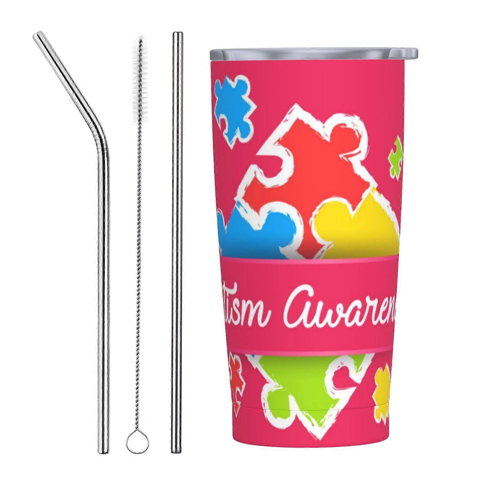 Autistic Autism Awareness Day Month 2023 20 Oz Insulated Stainless Steel Coffee Travel Mug With Straw Portable Thermal Cup Straw Three-Piece Set