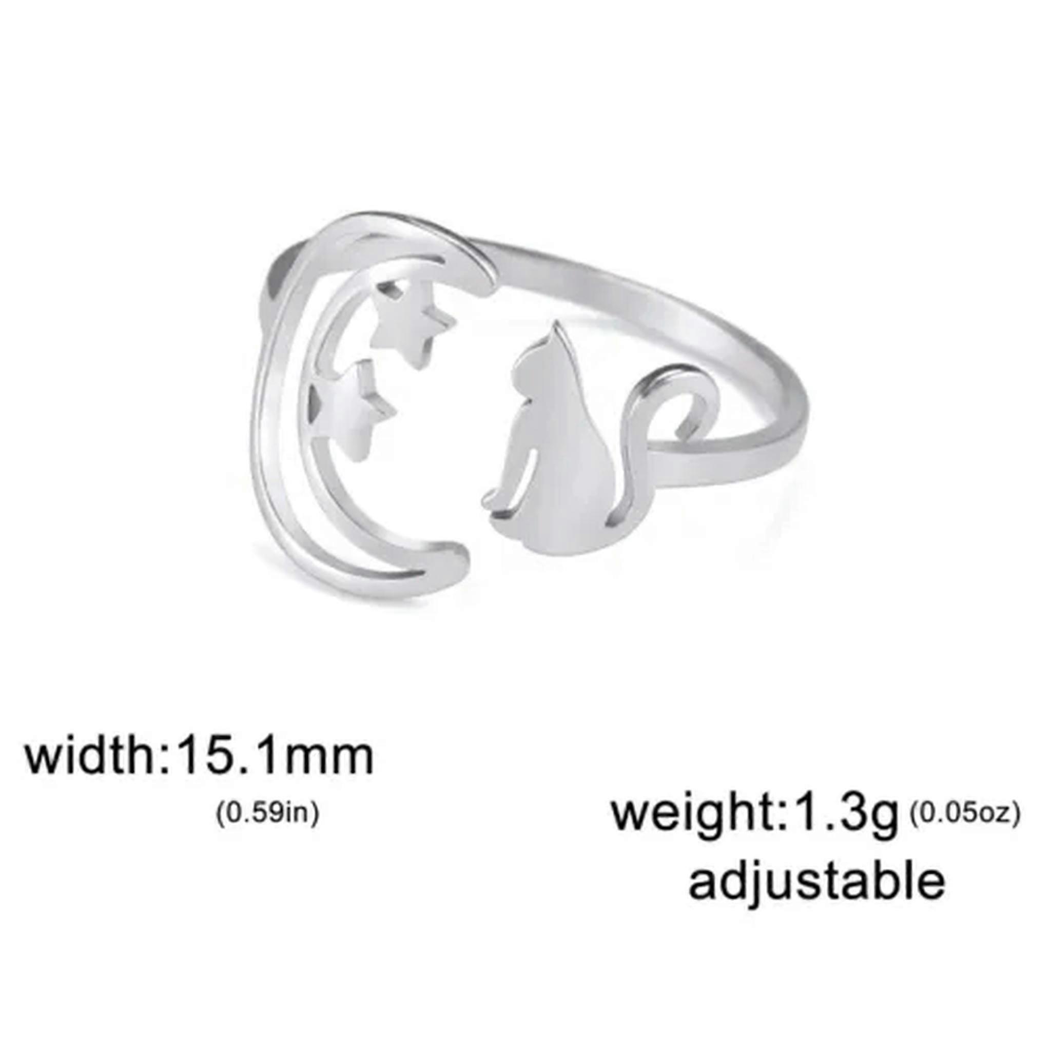 RSAMD Moon Star Cat Ring Stainless Steel Fashion Animal Open Finger Rings Jewelry-Resizable-Silver