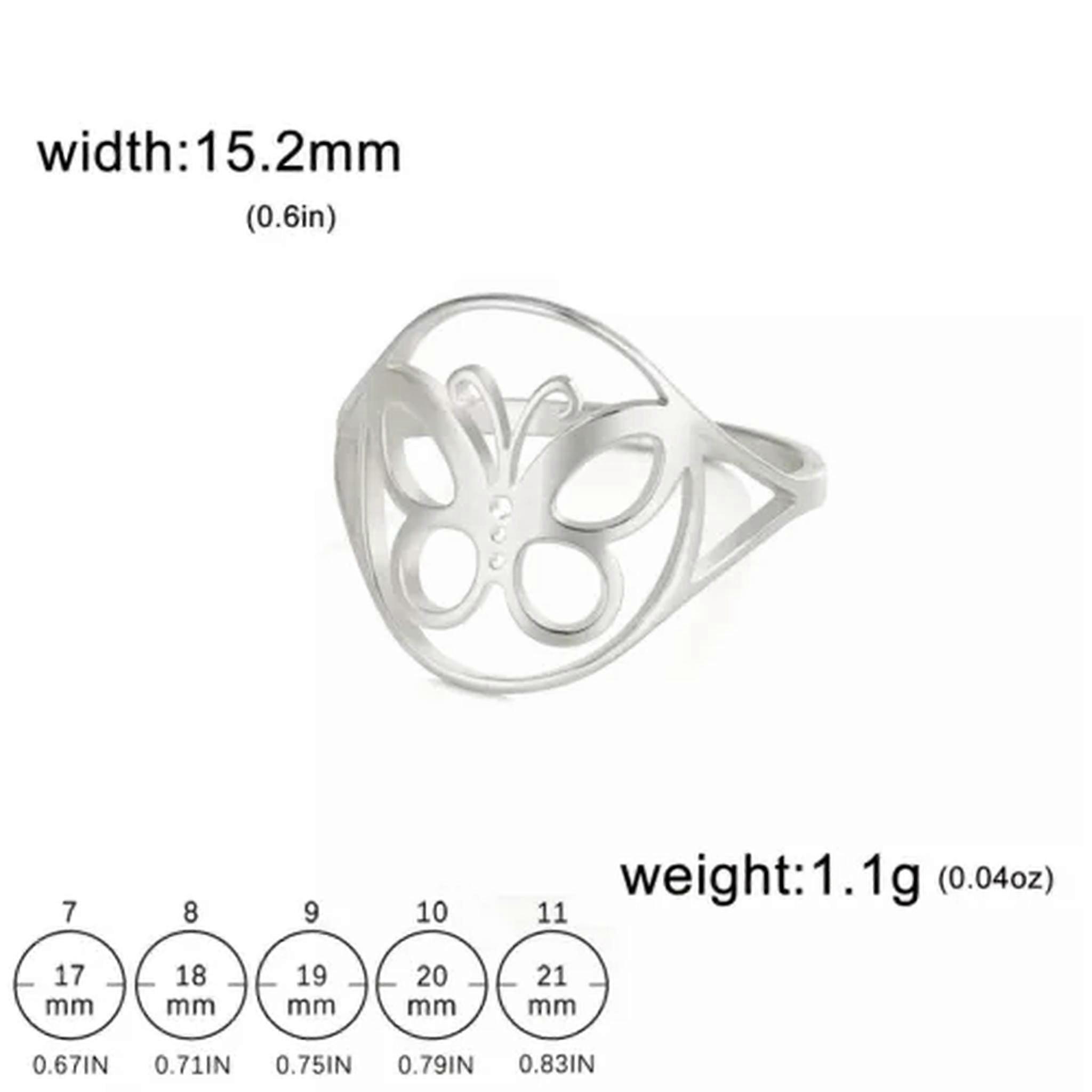RSAMD Butterfly Finger Rings Women Simple Hollow Stainless Steel Ring Fashion Jewelry-7-Steel Welcome to our jewelry emporium that's brimming with dazzling options for every style seeker. For the lovely ladies, we have an array of enchanting pieces. From the dainty necklaces that delicately adorn your collarbone to the elaborate rings that make a bold statement. There are bracelets that add a touch of grace and earrings that enhance your beauty. But don't think we've forgotten about the gentlemen! We have a selection of masculine and stylish accessories too. Sturdy rings for a touch of rugged charm, sleek bracelets that exude sophistication, and understated necklaces that add a hint of refinement. Our collection combines timeless classics with modern trends, crafted with precision and using top-quality materials. Whether you're looking for a piece to wear on a daily basis or for a special event, we've got you covered. So, step into our world of jewelry and discover that perfect piece that reflects your individuality, no matter your gender! Suitable for Gifting Fit for Every Occasion 100% New and of High Quality Crafted from Professional-Quality Materials Easy to Pair and Wearable at All Times and Places