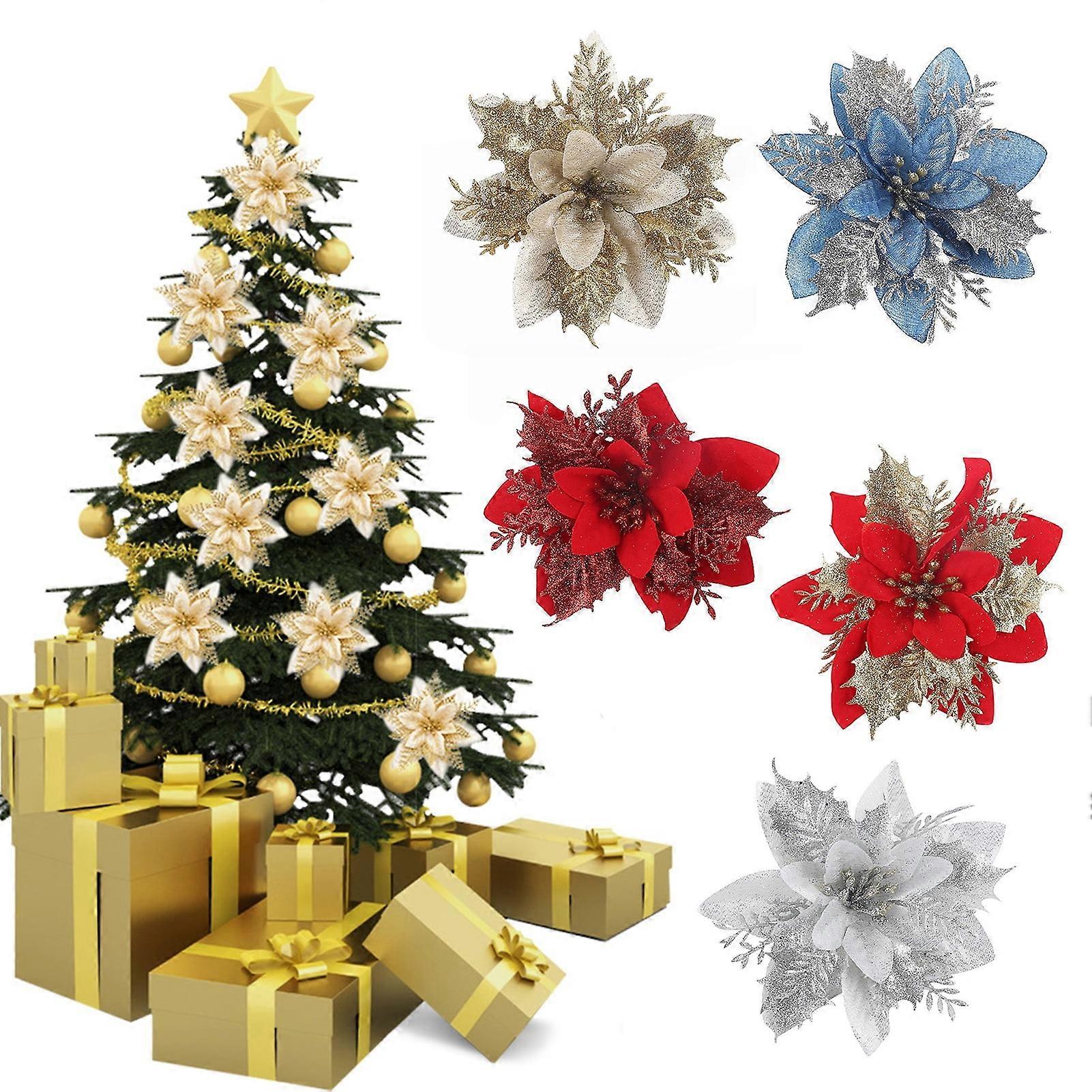 Description: Introducing our Christmas flower set, the perfect addition to your holiday decorations. This set includes 10 pieces of beautiful and lifelike flowers that will create stunning displays when combined with ribbons, garlands, branches, and more. These bright and vibrant flowers will maintain their color and shape year after year, adding a festive touch to your home and gatherings. Decorating your Christmas tree has never been easier with these sparkling Christmas flowers. They will attract a lot of attention and help you have a warm and lovely Christmas. Unlike real flowers, these artificial flowers are low maintenance and don't require meticulous care. They are not as fragile as real flowers, making them more conducive to DIY projects. The wide range of applications makes these flowers the best choice for your Christmas bauble, Christmas tree decoration, garland, fireplace decoration, bookshelf decoration, winter decoration, door decoration, Christmas party decoration, fireplace decoration, table decoration, doorway decoration. Add gorgeous color to any place with these stunning artificial flowers. Item Name: Christmas Flower Material: Fabric Applicable Holidays: Christmas Features: Glitter Leaves, Reusable, Holiday Decor Size Details: Length: 15cm/5.91" (Approx.) Notes: Due to the light and screen setting difference, the item's color may be slightly different from the pictures. Please allow slight dimension difference due to different manual measurement. Package Includes: 10 x Christmas Flowers Set of 10 realistic Christmas flowers for stunning holiday decorations. Maintain their color and shape year after year, adding a festive touch to your home. Sparkling flowers attract attention and create a warm and lovely Christmas tree. Low maintenance and durable, perfect for DIY projects and various decorations. Versatile use for Christmas baubles, garlands, fireplace, table, and doorway decorations.
