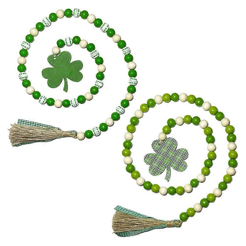 2 Pack St. Patrick's Day Wood Beads Garland with Tassels, Green Wooden Beads with Shamrock Pendants, Farmhouse Irish Home Decor