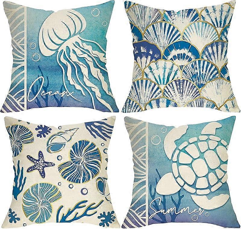 Summer Ocean Blue Pillow Covers 18x18 Set of 4, Compatible with Coastal Jellyfish Sea Turtle Shell Conch Decor