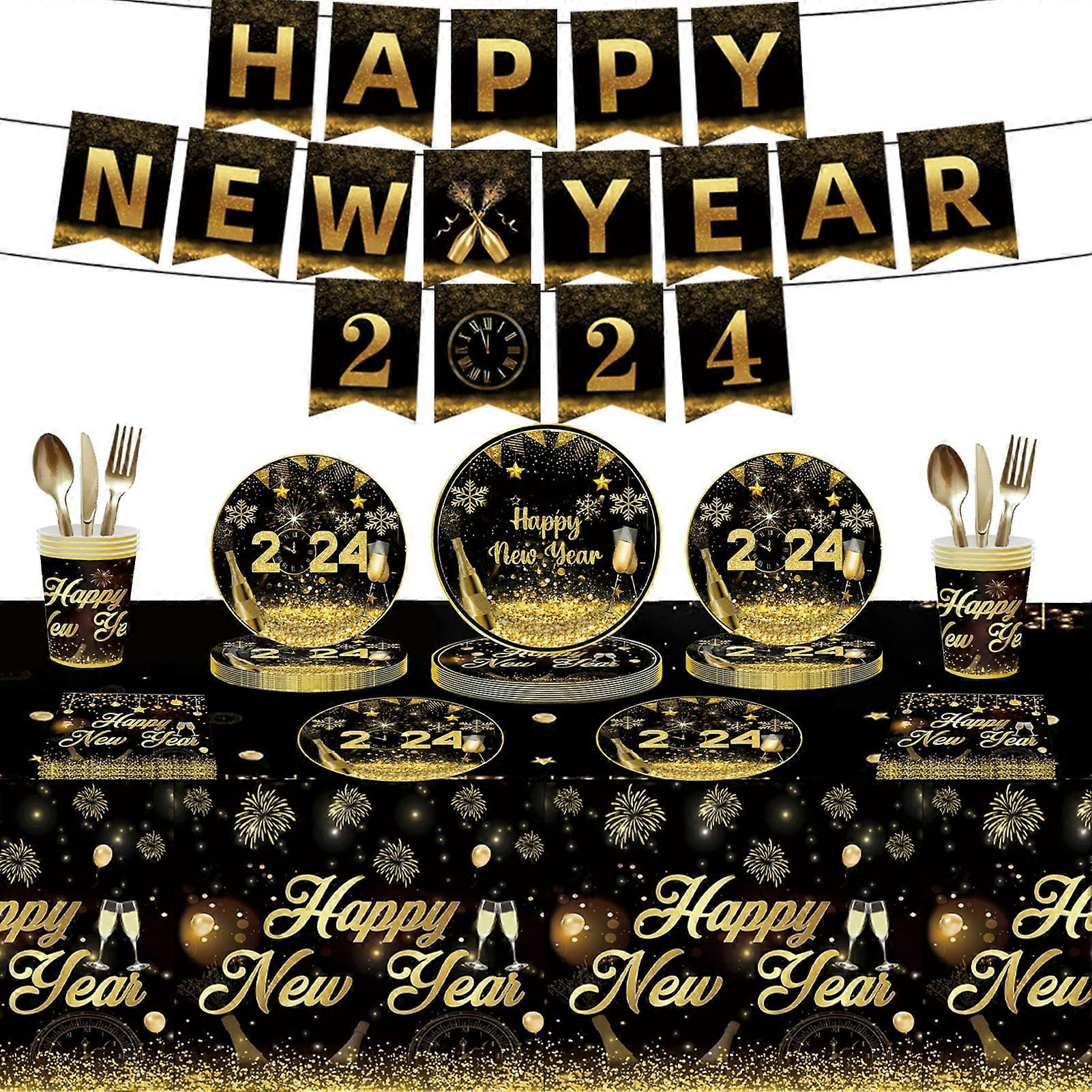 Leaveforme Disposable Tablecloths Tableware Set for Party Celebration Disposable Tablecloth Plates Napkins Cups 2024 New Year Decorations