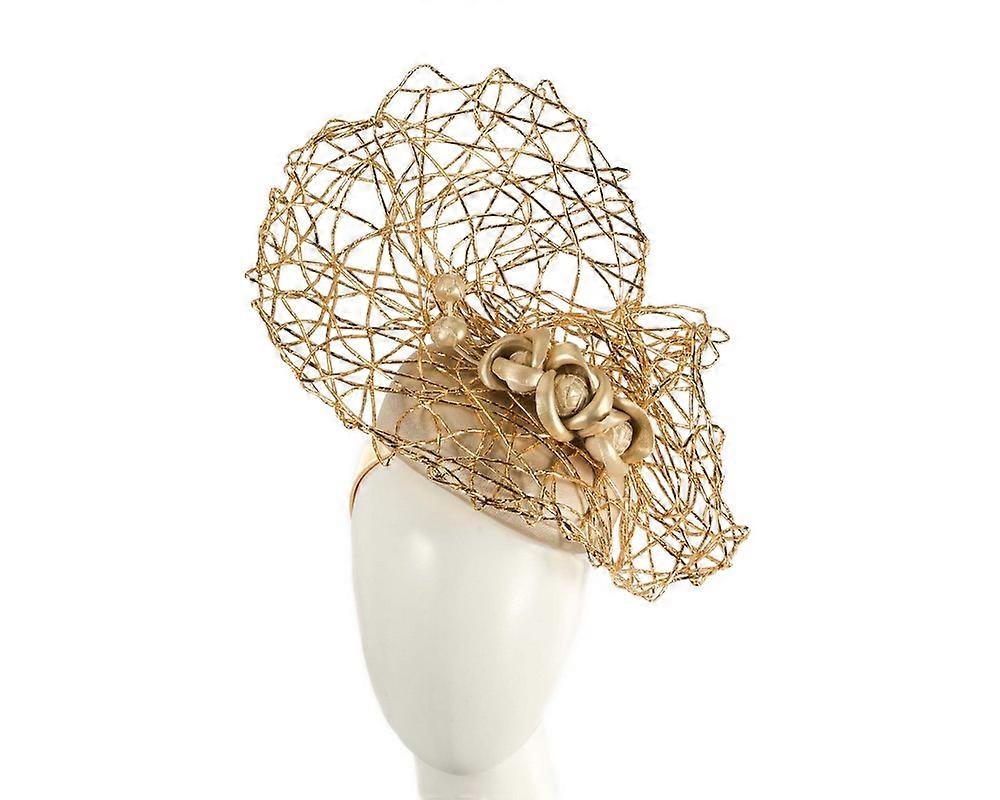 Exclusive gold pillbox fascinator by Cupids Millinery. One-off creation featuring pillbox base decorated with stylish mesh of gold web and topped with matching leather flower. Made in Australia Cupids Millinery Melbourne creation Exclusive one-off design Hеаdbаnd for easy wear