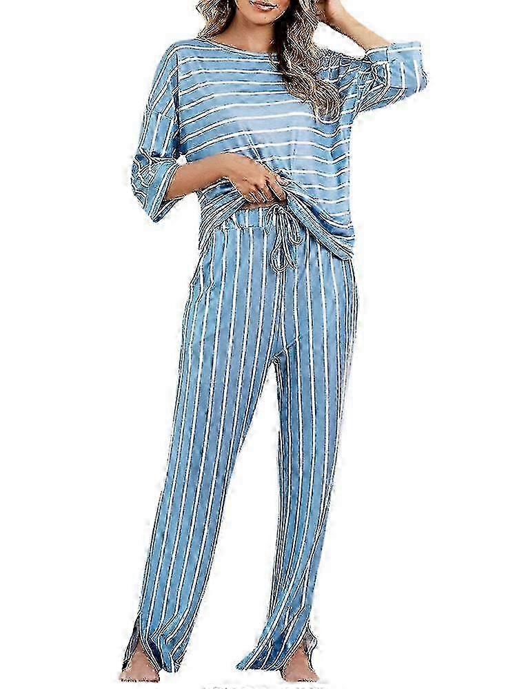 w Women's Striped Pajama Set: Round Neck Top & Pocket Pants