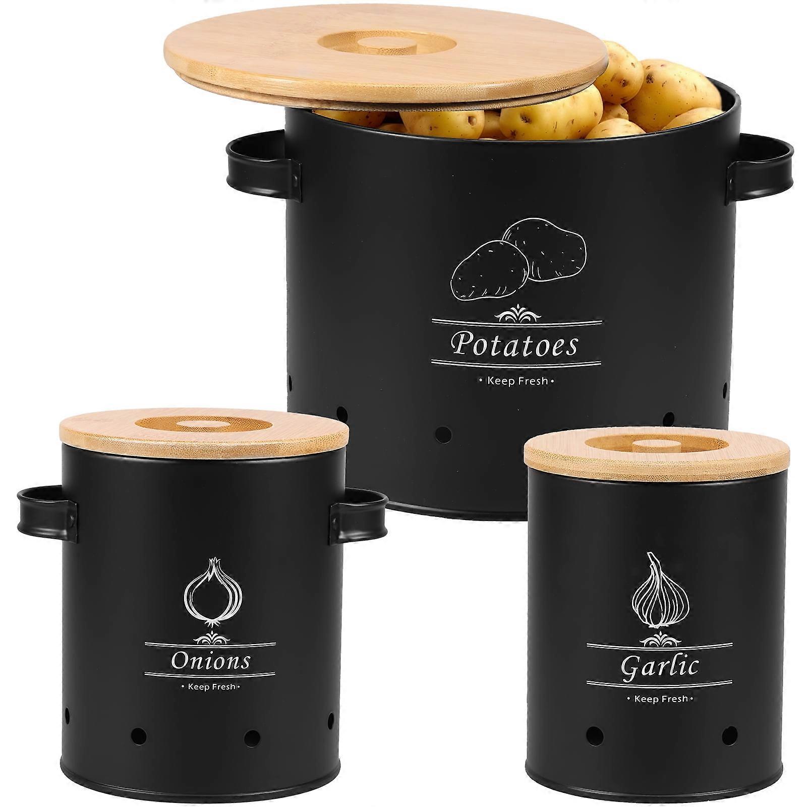 3Pcs Onion & Potato Storage Canisters, 3 Sizes, Carbon Steel Tins with Handle, Stackable Vegetable & Garlic Bin for Kitchen