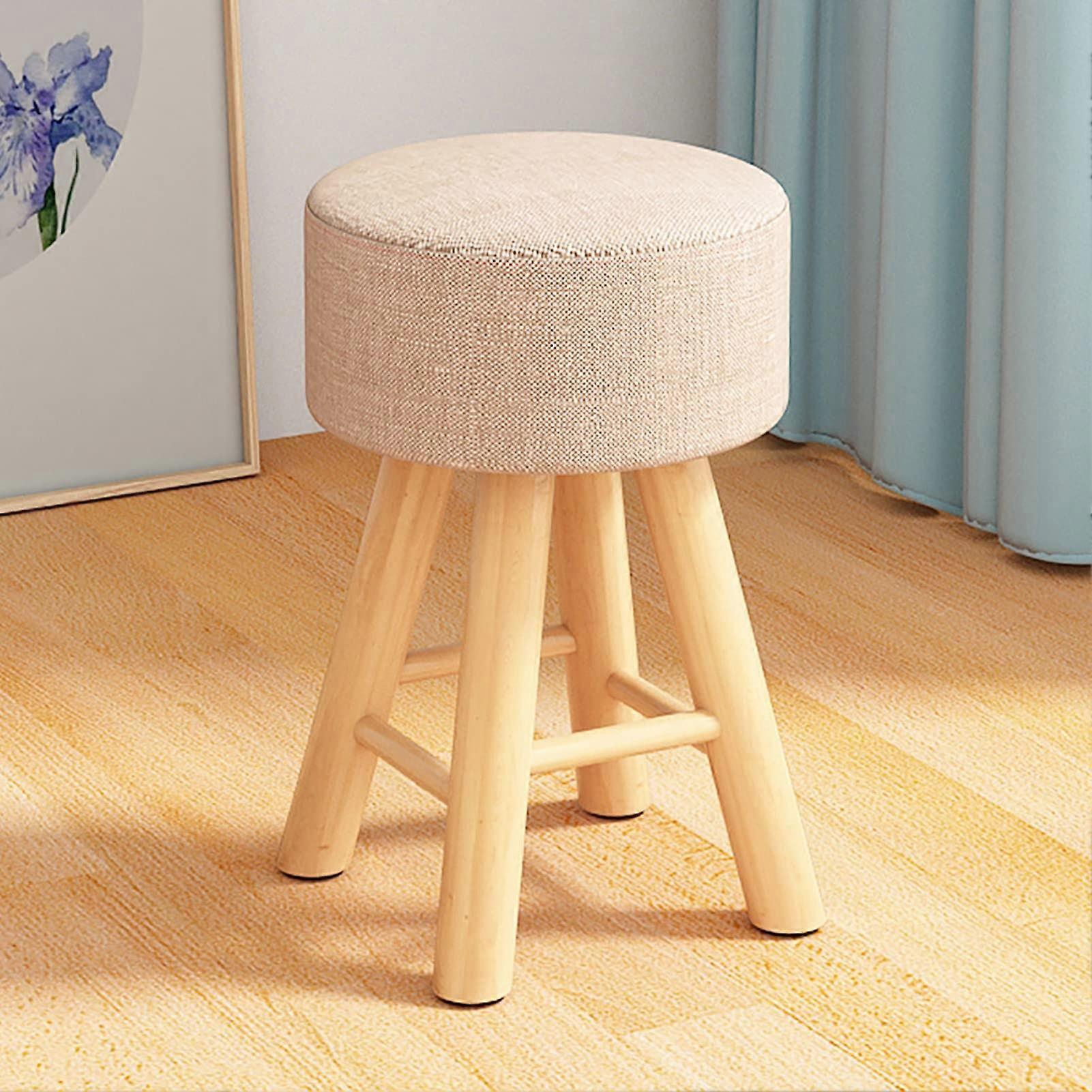 Beige Round Footrest Ottoman with Linen Upholstery and Solid Wood Legs for Living Room, 40cm