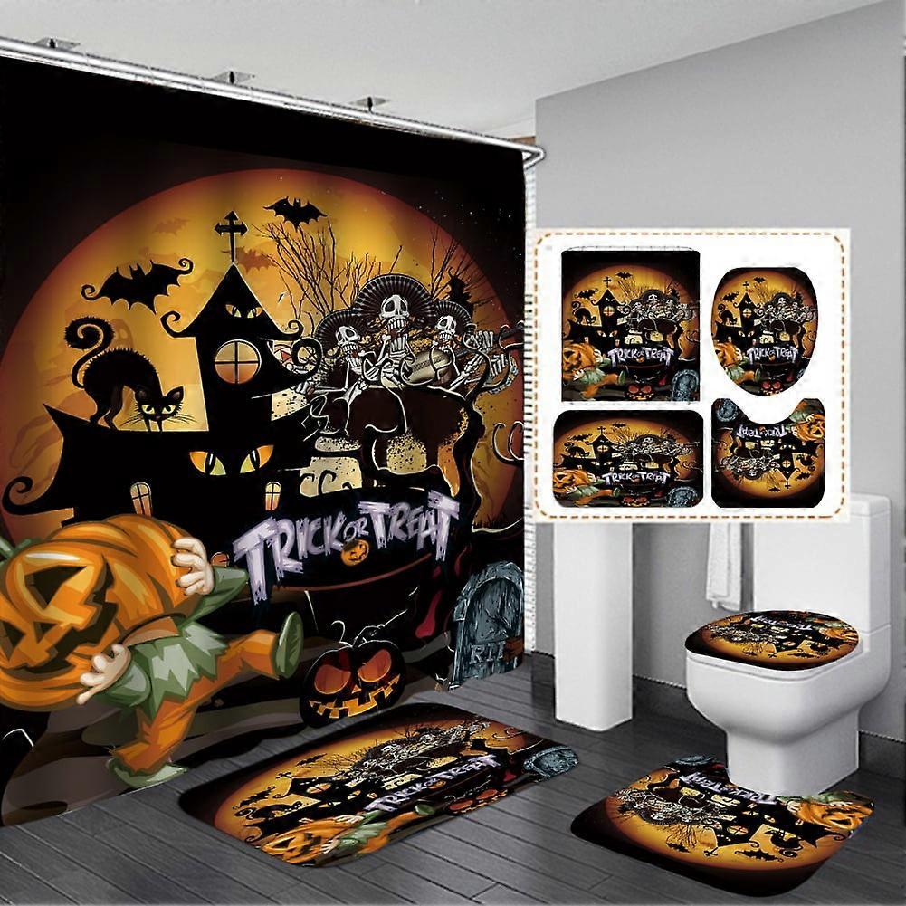 4 PCS Halloween Shower Curtain Set with Non-Slip Rugs, Toilet Cover & Bath Mat, Pumpkin Castle Witch Design + 12 Hooks, Waterproof