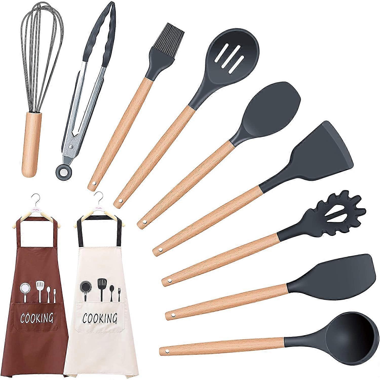 Silicone & Wooden Cooking Utensil Set, Kitchen Essentials, Compatible with Non-Stick Pans, Black