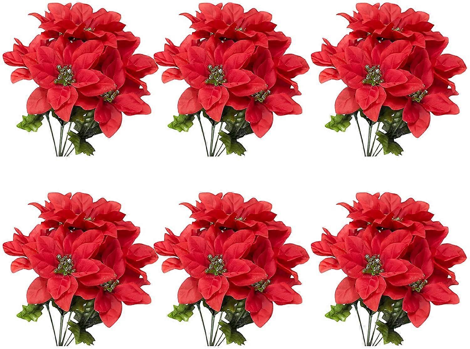 6Pcs Artificial Poinsettia Christmas Flower, Red Poinsettia Bouquet Golden Stamen Faux DIY Holiday Flower Arrangements for Indoor Outdoor Xmas Decor