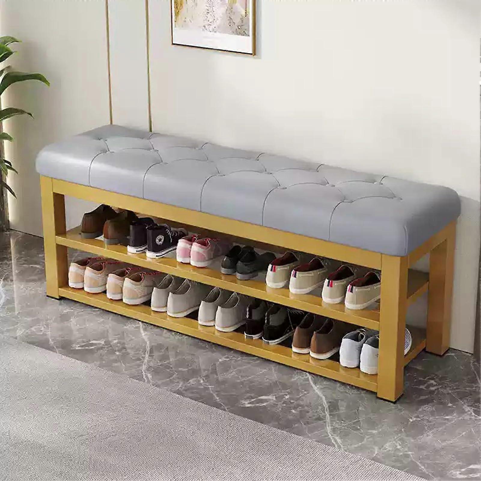 3 Tier Shoe Bench with Leather Cushion and Storage for Entryway Hallway Bedroom (Gray Gold 60x35x48cm)