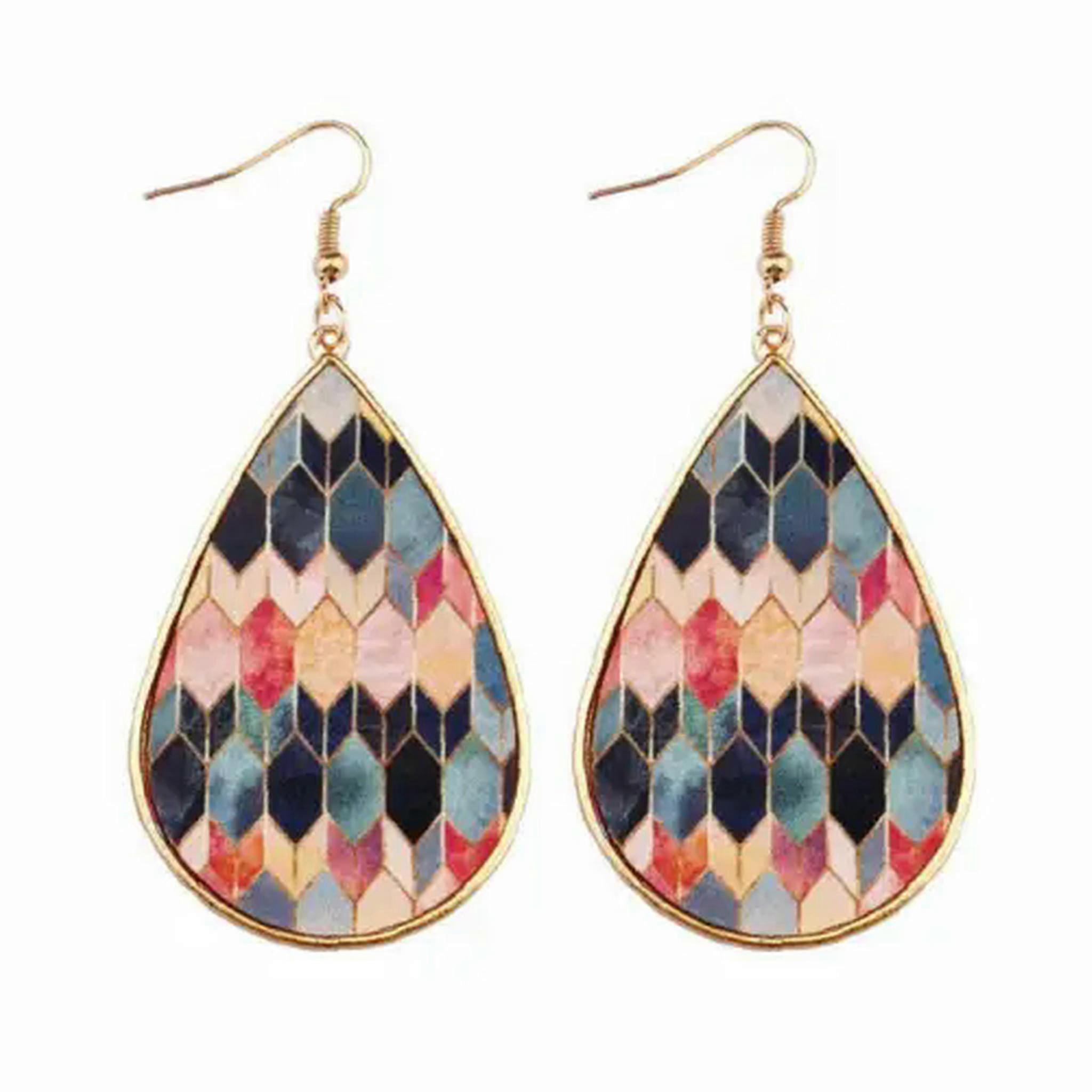 RSAMD Print Leather Floral Square Gold Tone Teardrop Women Statement Moroccan Earrings-Square