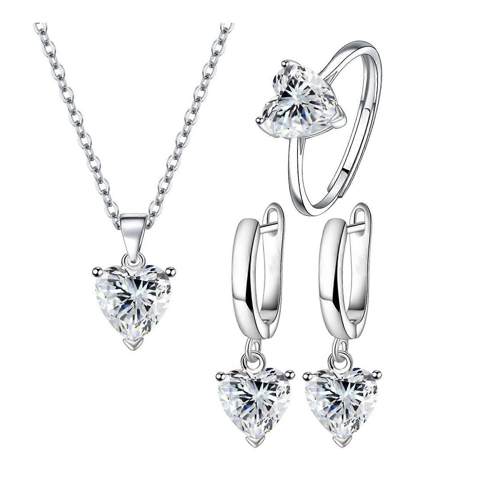 3 Pcs/Set Women Jewelry Set Heart Cubic Zirconia Huggie Earrings Adjustable Necklace Bride Ring Prom Party Wedding Jewelry