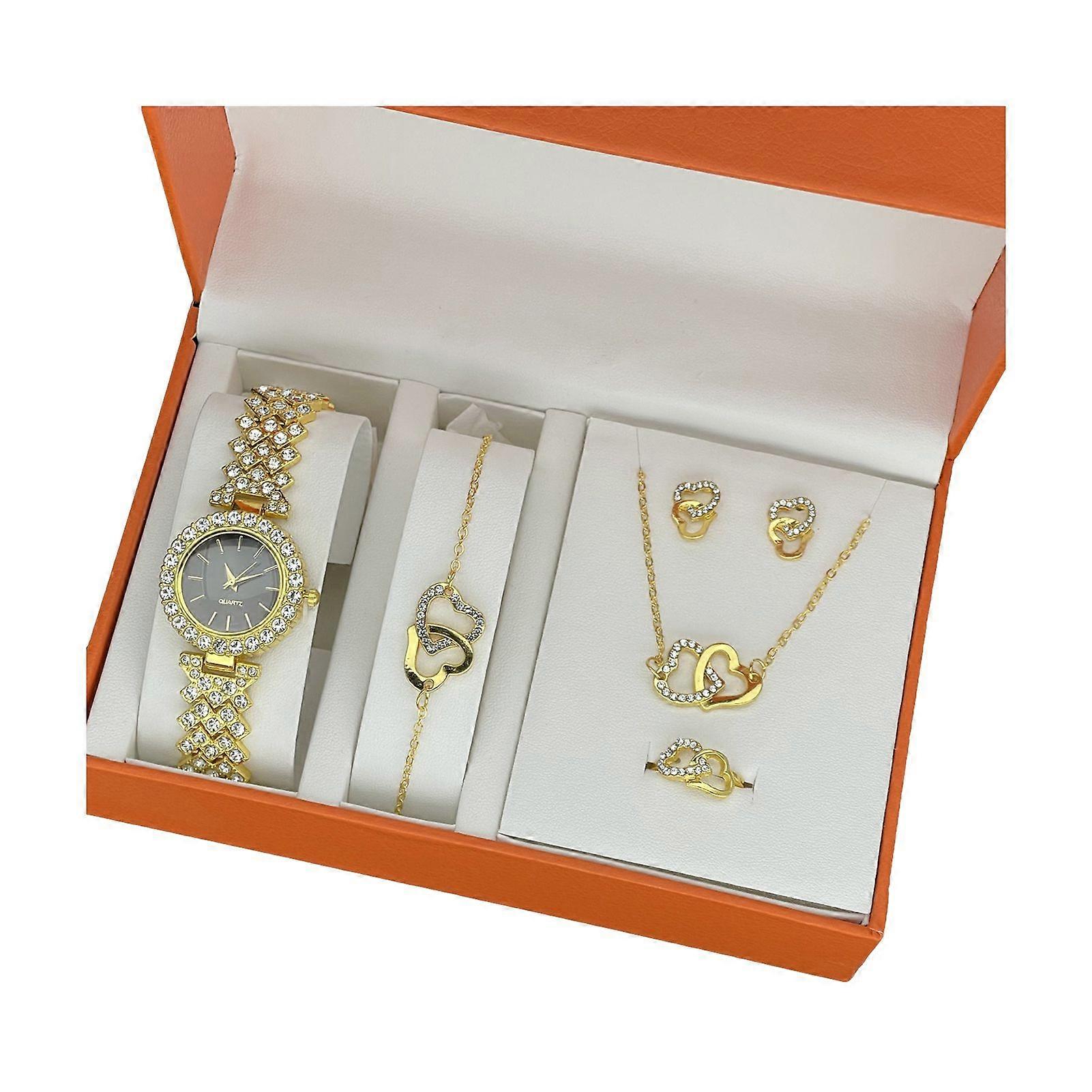 1 Set Women Jewelry Set with Gift Box Complete Collection of Quartz Watch Necklace Bracelet Ring Earrings Set Rhinestone Golden Jewelry