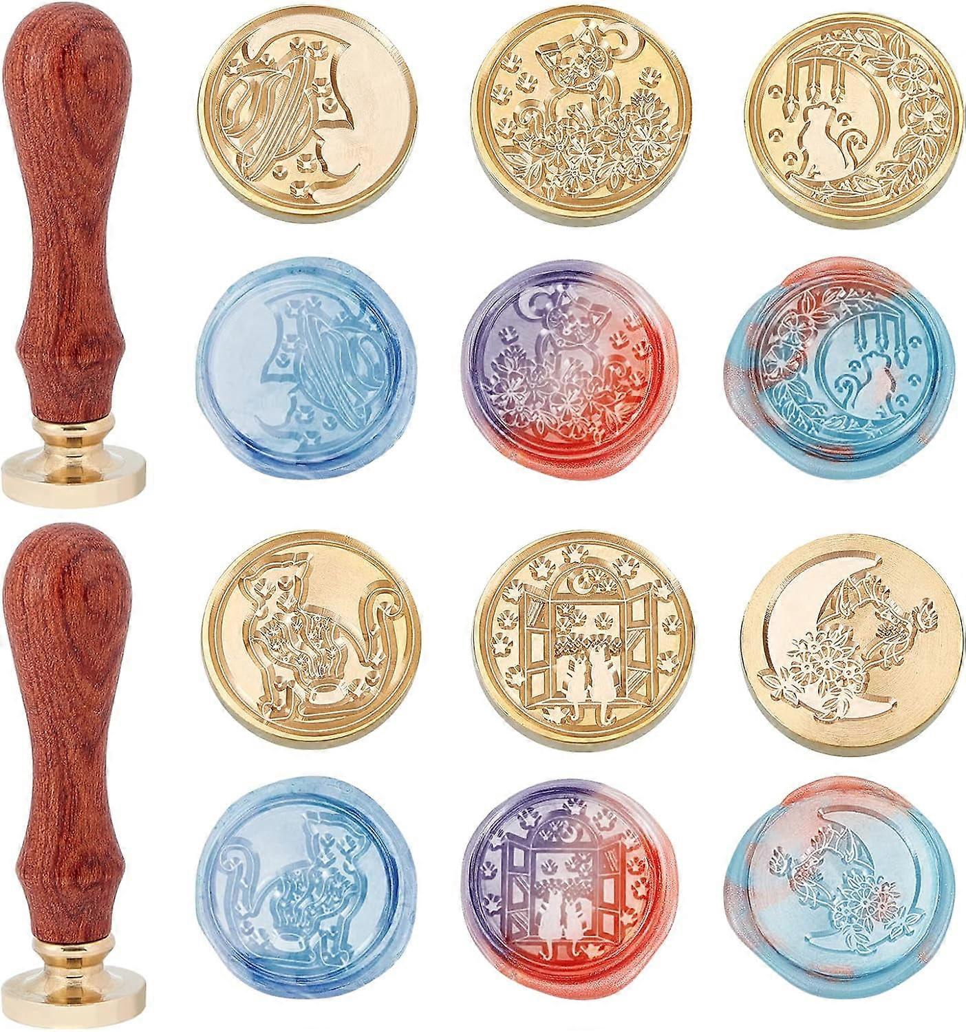 Wax Seal Stamp Kit 6pcs Cat Animal Patterns, Compatible with Wax Sticks, 2 Wooden Handles, Vintage Seal Kit for Cards, Envelopes, Invitations
