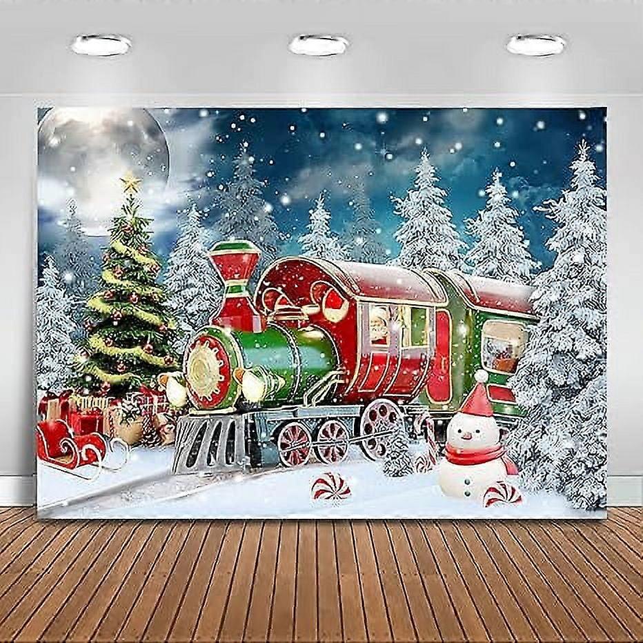 Winter Christmas Cartoon Train Backdrop, Snowy Night with Pine Trees, Xmas Party Decor for Kids Wonderland Photography (150x210cm)