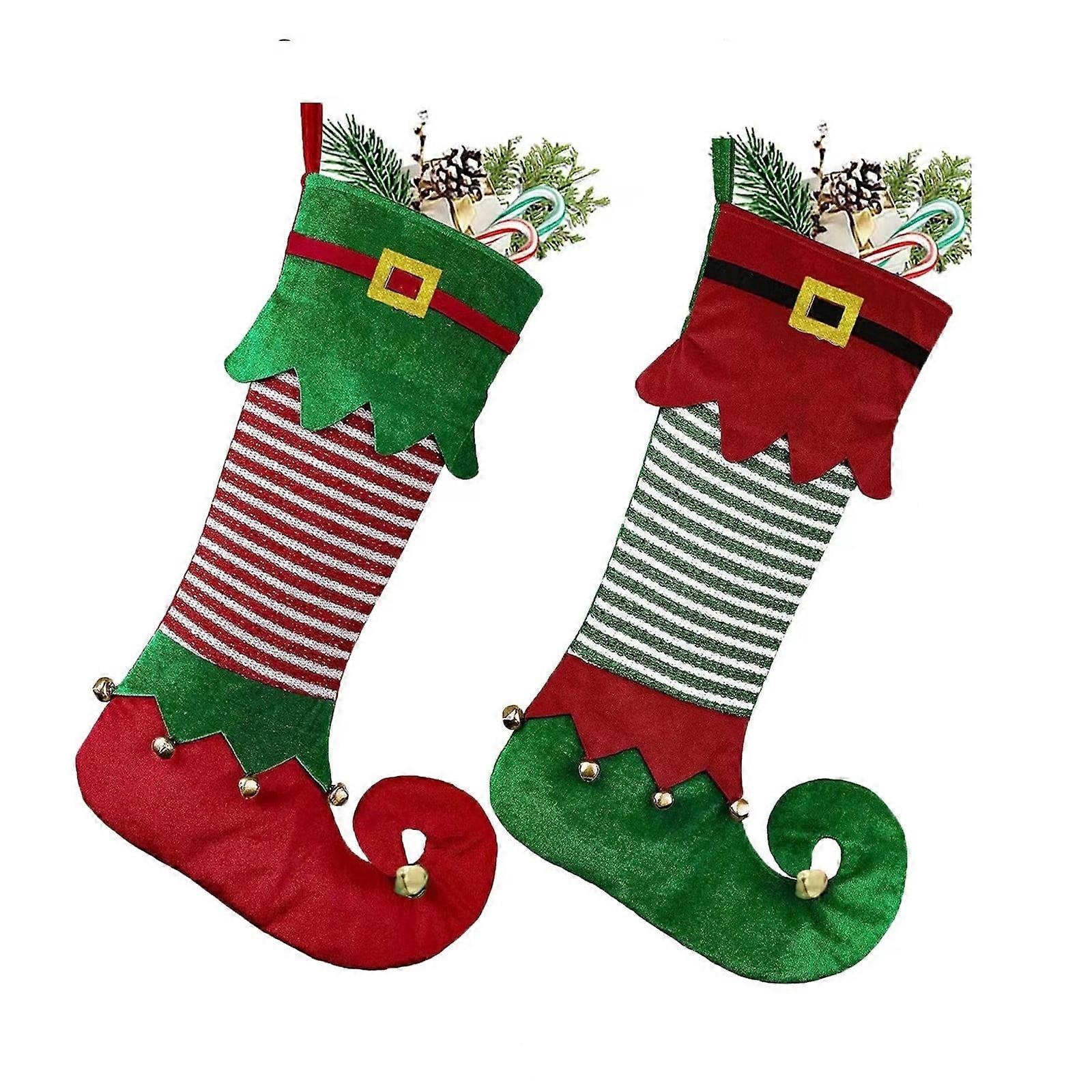 1 Pair Elf Christmas Stockings, 22" Red Green Cuff, Knit Stripe, Compatible with Holiday Decor & Santa Gifts