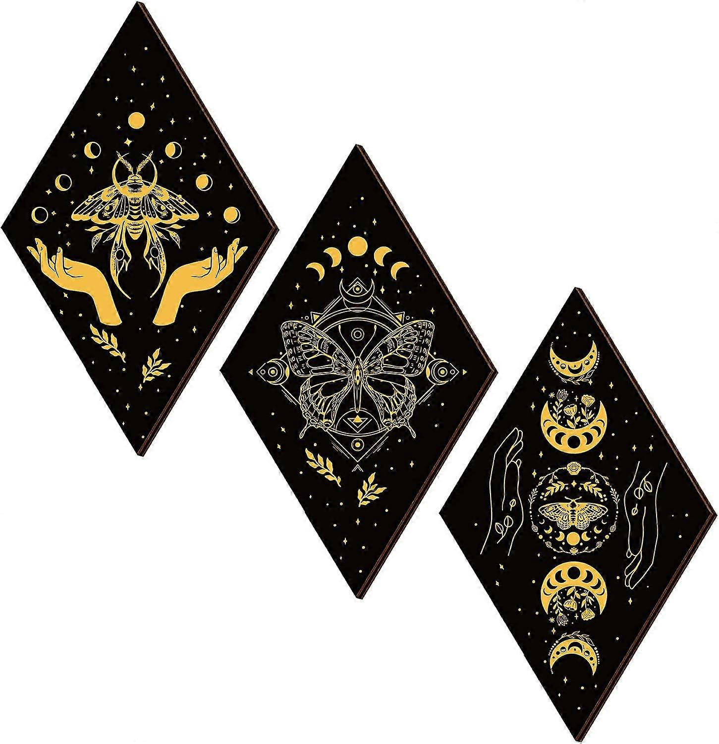 3Pcs Rustic Boho Wall Decor Moon Phases Stars & Butterfly, Gothic Witchy Wooden Wall Hanging for Home, Gold 6.7x11.8Inch