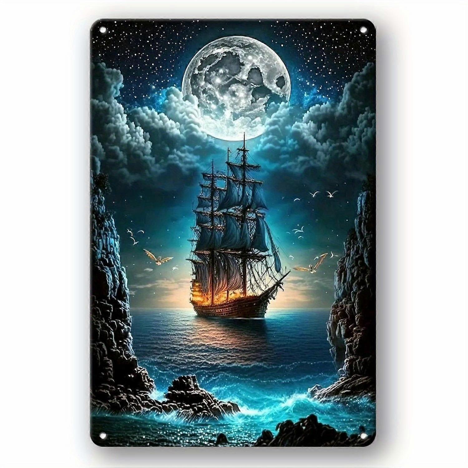 1 Pc Vintage Pirate Ship Metal Tin Sign 12"x8" - Wall Decor for Coffee Shop, Bar, Bedroom - Compatible with nautical theme decor