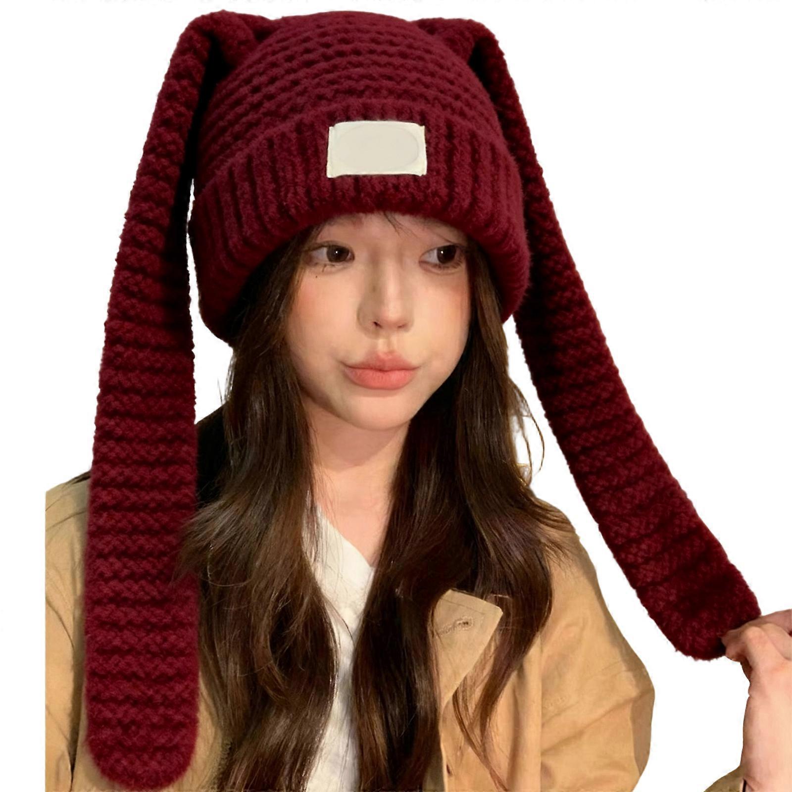 Oversized Knit Hat with Ear Lovely Colorful Skiing Hat Rabbit Ears Cartoon Photo Props Outdoor Head Wrap for Halloween Burgundy