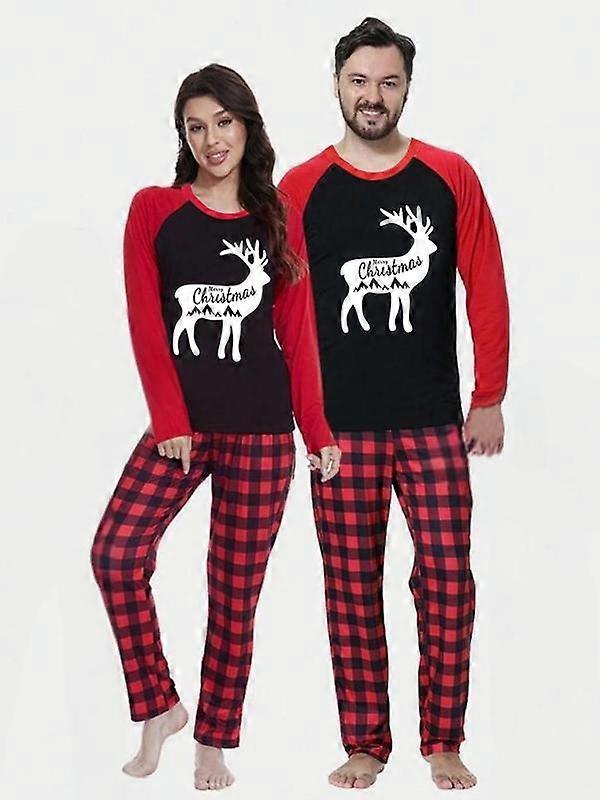 Couple Pajamas Set Christmas Deer Print Long Sleeve Round Neck Pants Casual Comfortable Wear at Home for Men Women