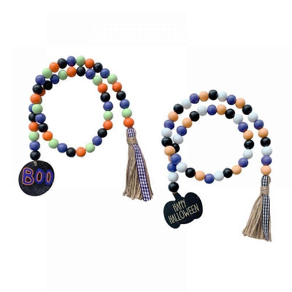 2Pcs 34" Halloween Wood Bead Garland with Jute Rope, Plaid Tassel Tag, Natural Fall String Decor for Farmhouse, Nursery Room