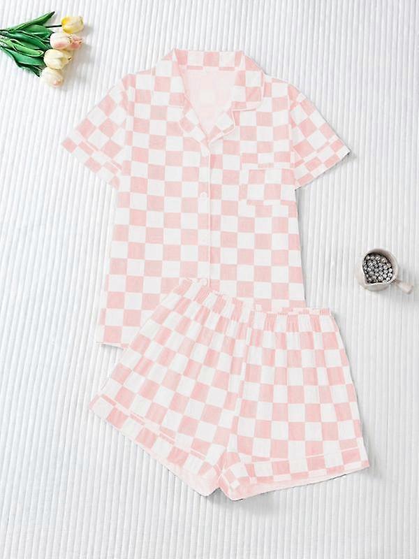 Women's Plaid Button Front Sleepwear Set, Short Sleeve & Shorts Two-Piece Pajama Set, Casual Loose-Fit Home Wear for All Seasons, Loungewear