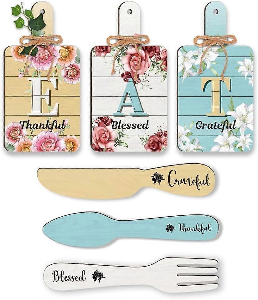 6pcs Flower Kitchen Wall Decor Wood Sign Eat Sign Fork Spoon Wall Decor Hanging Plaques Farmhouse Cutting Board Sign with Hemp Rope for Home Kitchen Dining Living Room Bar Cafe DIY Rustic Wood Sign: package includes 6pcs flower wall decorative sign in 6 styles--3 x cutting board sign, 3 x fork and spoon sign; printed with letters "e", "a", "t" and inspiring wishes and aspirations; perfect country home decorations. Reliable Quality: the farmhouse kitchen pieces are made of wood, reliable and sturdy, well polished, smooth surface, stable and durable, can be reused for a long time. Bring a warm atmosphere to your home. Easy to Hang: each art hanging sign is predrilled with a large hole, can be easily hung on walls, fireplace and window directly or by a rope, or just used as tabletop decor, time and effort saving.(Decorative hemp rope included) Size Details: cutting board signs: 11 x 5.5 inches/28 x 14 cm, tableware signs: 11.8 x 2.3 inches/30 x 6 cm, proper size, will not take up too much space to decorate, coordinating with other decorations. Wide Applications: the wooden wall art pieces adorn your kitchens, dining halls, office, classroom, bedroom, living room, outside gardens, porches, bakery, coffee shop, hotel, restaurant, etc; creat a relaxing surroundings.