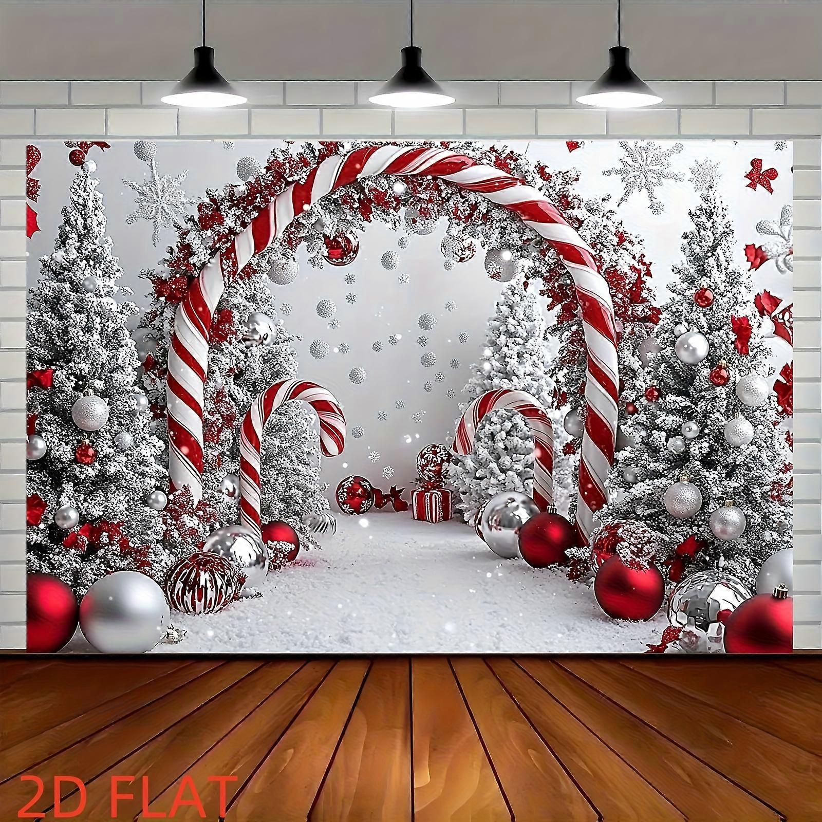A shiny Christmas tree background cloth with candy sticks and a party banner featuring snowflake patterns