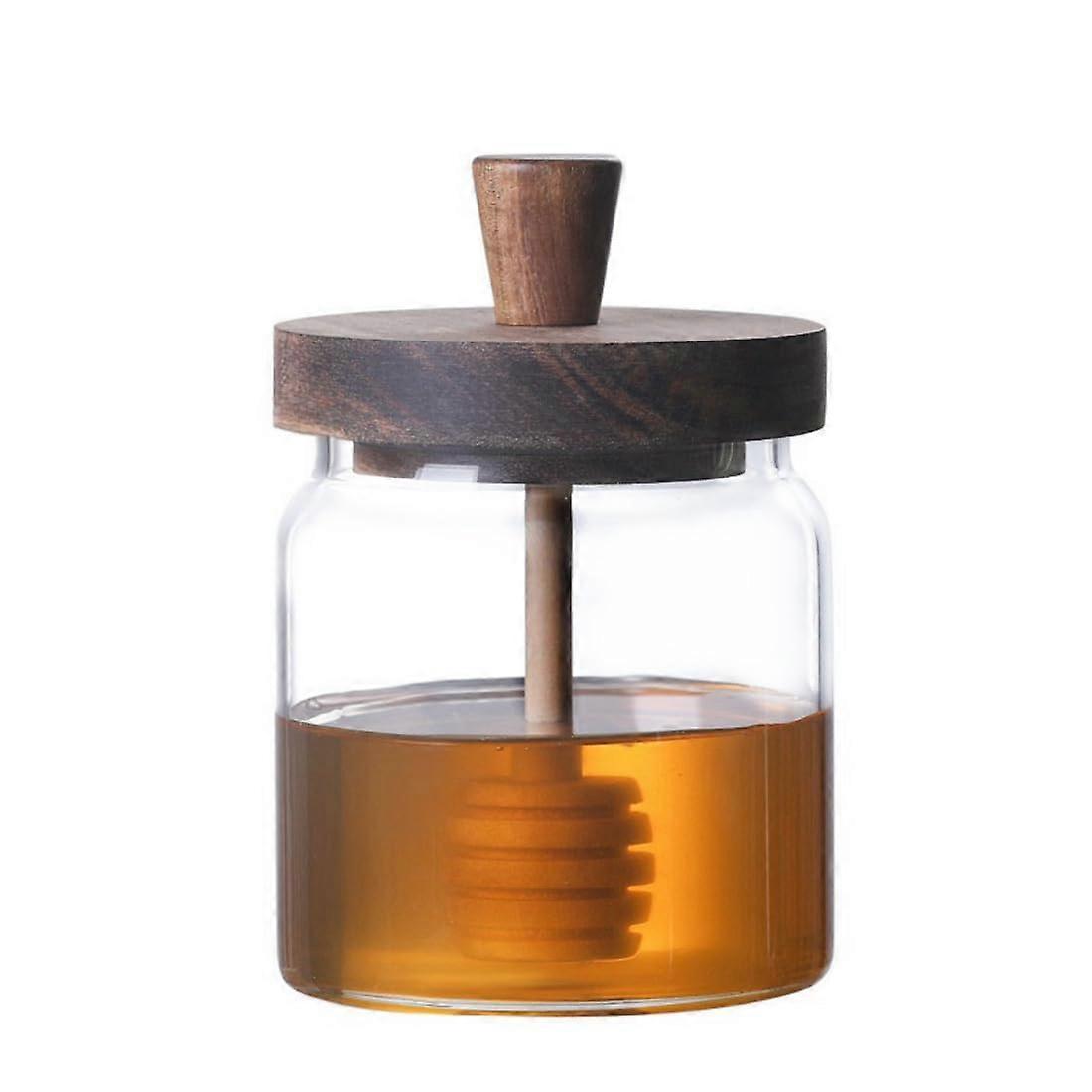 Honey pot, sealed glass honey jar with dip stick and wooden lid, honey container, Mason jar for household kitchen
