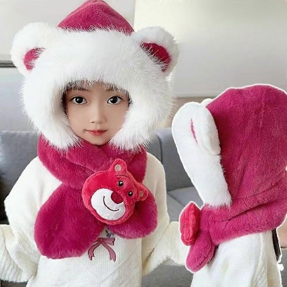 Disney Children's Winter Hat and Scarf Set Pink Strawberry Bear Windproof Earmuffs Stylish Warm Ski Hat Two Pcs Set MINISO