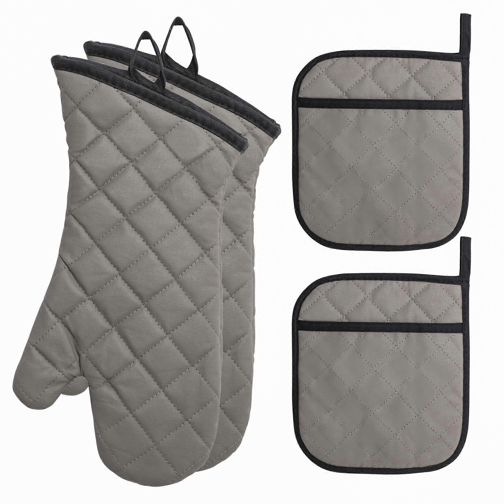 Oven mitts and pan holder Set quilted lining - Heat resistant kitchen oven mitts, Flame oven mitts set, gray, 2-piece set
