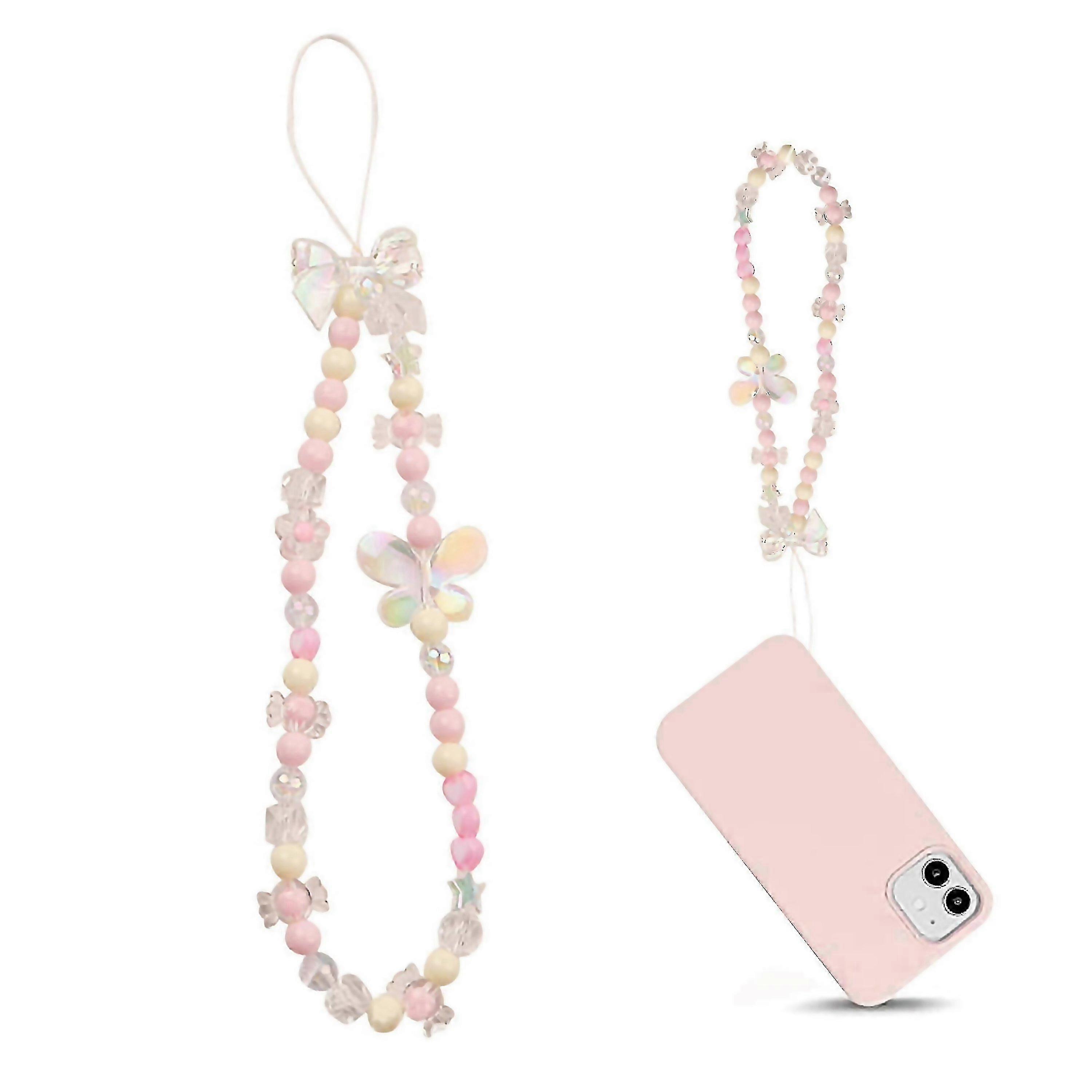 For Cute Beaded Phone Charm Butterfly Lanyard Strap Antilost Wrist Rope Pink