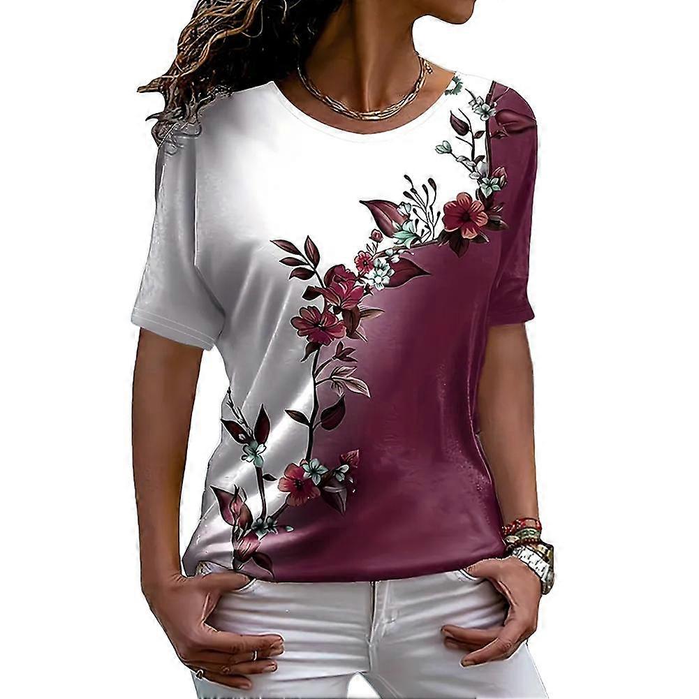 Fashionable Floral Color Block Round Neck Short Sleeve Printing T-Shirt