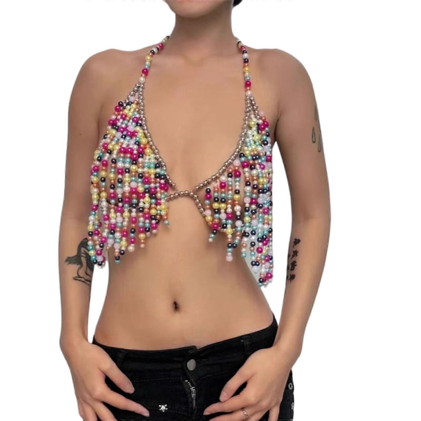 Colorful Breathable Beaded Bikini Coverup Top With Adjustable Body Chain Jewelry Lightweight Summer Wear Chain Beachwear One Size