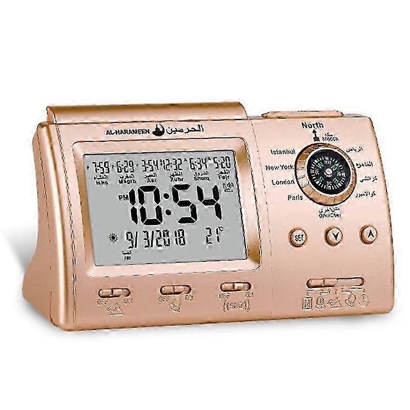 Complete azan for all prayers (with volume control). Prayer times for most cities around the world. Qibla direction(relative to the North). Hijri and Gregorian calendars. The Hijri calendar follows the Gregorian date and is based on the astronomical moon sighting at Mecca. Complete azan for all prayers. Characterized clock with a high quality azan sound for all prayers with azan volume control fitted in all clock models. Six system taqweem programmed in clockAutomatic fajr pray alarm: This unique feature allows you to wake up every day exactly at the same time relative to Fajr azan. For example, suppose you set the alarm to 5:15 AM and the Fajr azan is at 5:05 AM. On the next day, if Fajr azan becomes 5:06 AM, then automatically this alarm will change to 5:16 AM. In this case, you will wake up 10 minutes after Fajr azan every day.Daily alarm : Alarm to work and school; The daily alarm is a regular alarm that rings at the same time everyday. Moreover, this alarm can be set not to ring on weekends. Crescendo sound: All alarms have gentle wake-up sound that increase gradually. One Time Alarm: In addition to Fajr and daily alarms, clock includes an extra alarm ( called 1-Day alarm ). It can be set to ring for special appointments.Temprature display - Temperature reading in Celsius (C) is displayed. Snooze option; Full screen El light; Audio out (Connect with speaker); DC 6 Volts external input 300MA; Daylight Saving Time option ( for countries using this system ); Gentle prayers reminder ( when azan sound is turned off ); Could easily modify the diference time prayer to the outskirts of cities adopted ituses the local taqweem or the most widely used taqweem system for your city. Other standard taqweem systems are available as follows:(DF) Local taqweenSaudi Arabia Taqweem Um Al-QuraGulf countries & Arabian Peninsula local taqween and Palestine: Jordanian taqweenEgypt and other Arab countries: Egyptian taqweenNorth America: Union Islamic Society of North America (ISNA)Indian subcontinent: University of Islamic SciencesEurope and other countries Islamic World Organization(H) Selection Hanafi method for ASR18.17 Muslim World League (Muslim League)19:17 Egyptian taqweem (Egypt)18: 18 University of Science Islamic in Karachi (Hanafi taqweem)15:15 Union Islamic Society of North America (ISNA)1:30 fixed time ,Fajr time is determined as a fixed interval of time before shrooq time. Isha time is determined as a fixed interval of time after Magrib azan. This system is used in Northern Europe.DateFajr AzanFajr AlarmMAY 15:05 AM5:15 AMMAY 25:06 AM5:16 AM automatically changes to 5:16Colour: GoldMaterial: ABSSize: 15 x 6 x 8.5cmPackage Contents:1 x azan clockNote: Without batteryOnly the above package content, other products are not included.Note: Light and different displays may cause the color of the item in the picture a little different from the real thing. The measurement allowed error is +/- 1-3cm.