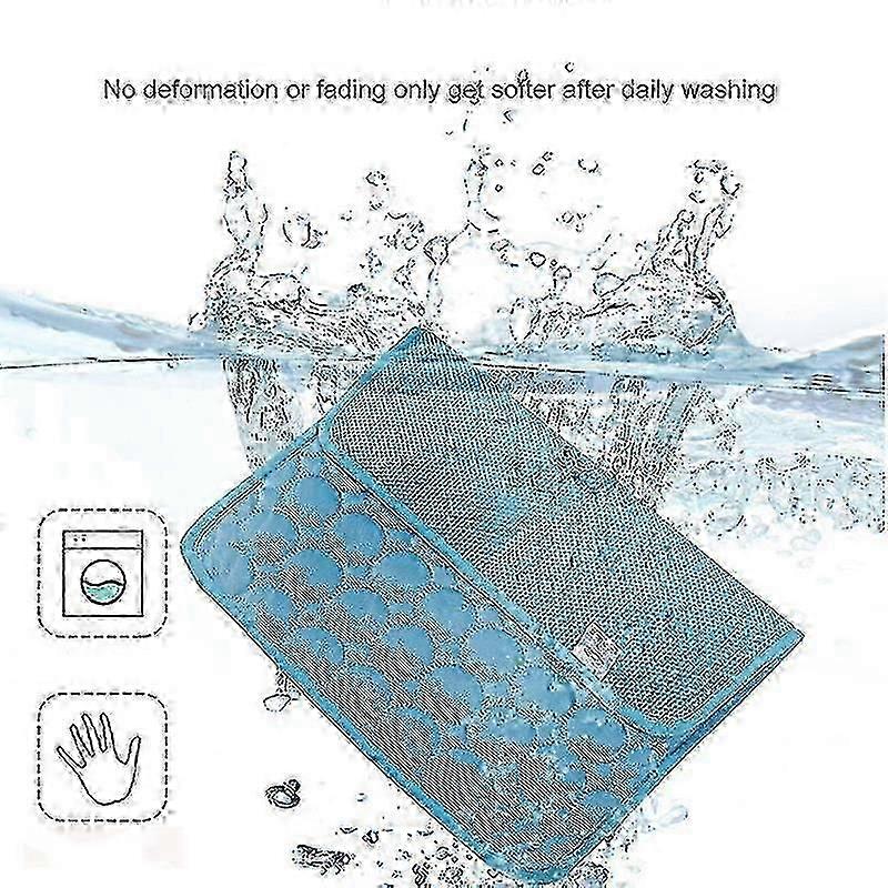 PET SAFE COOLING PET PAD: The dog cooling mat made of premium self-cooling fabric, soft, refreshing, comfortable,100% safe for animals, adults, kids. Never worry your lovely dogs/cats would eat the stuffing in the middle of the pet's ice pad by mistake like when you using other type of cooling pad.Lets enjoy a fast cooling feeling in this hot summer. It can soothe our dogs and cats on contact for up to 3 hours, providing a cool spot for our dog year-round.SELF COOLING MAT: 3-4 Degrees cooler by instantly touching, the pet cooling pads for dogs features high-tech cooling nylon fiber. Different from most pet kennel mats on the market, no water, electricity, or refrigeration needed, only to put the dog mat on the floor or sofa and keep the pet on it. It's a simple solution to avoid overheating and dehydration for hot, panting dogs that struggle in the summer weather.PORTABLE & MULTI-USE: The dog sleep mat is lightweight, as folds effortlessly.2 layers design but the thickness of the high technology fabric is 0.27 INCH only which means it doesnt take much room and you can easy to fold it and store it or take it to travel, which is ideal for use indoors, outdoors, and on the go.Can be used on sleeping beds, kennel mat, cover the car seats, lawn, beach, etc
