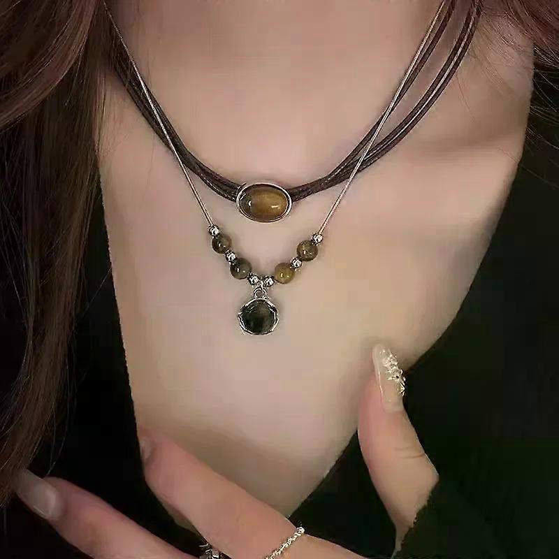 Vintage Leather Brown Stone Pendant Necklace Women's Retro Stacking Choker Temperament Clavicle Chain Hip Hop Jewelry Accessory