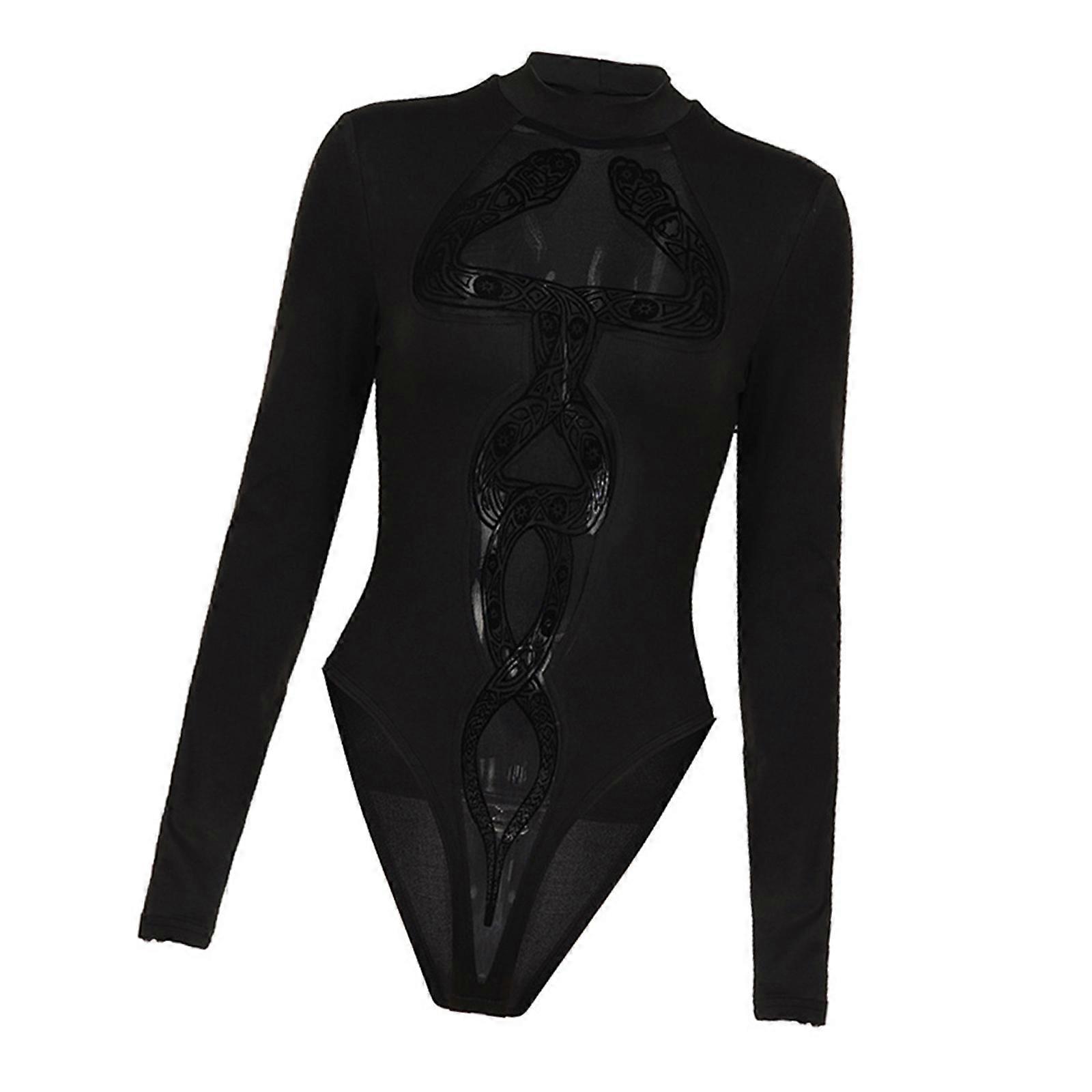 Stylish Snake Pattern Mesh Splicing Stretch Women Bodysuit Party Outfit Long Sleeve Mock Neck Jumpsuit For Special Event Black S