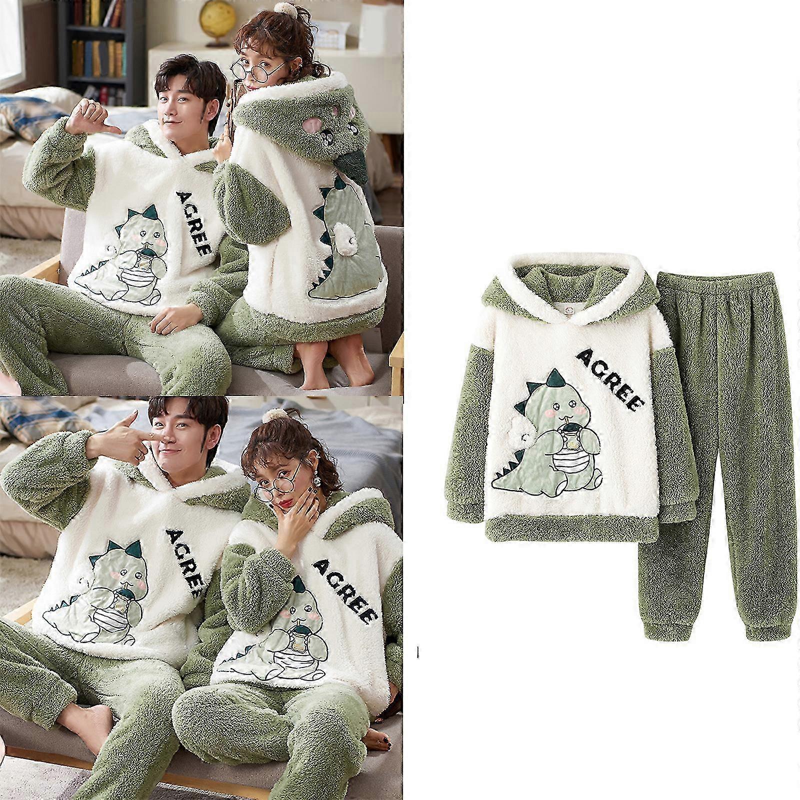 Women's Cartoon Dinosaur Print Flannel Pajama Set Warm Winter Hoodie Top and Pants Sleepwear Home Loungewear Outfit Green L