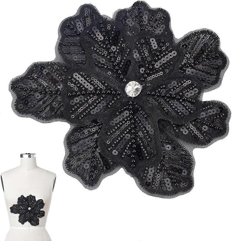 Black Handmade Rhinestones Applique Sewing Beads Stones 20x18cm 3D Flower Polyester Embroider Cloth Appliques Trim Lace Patches Sparkly Sew Beaded Acc