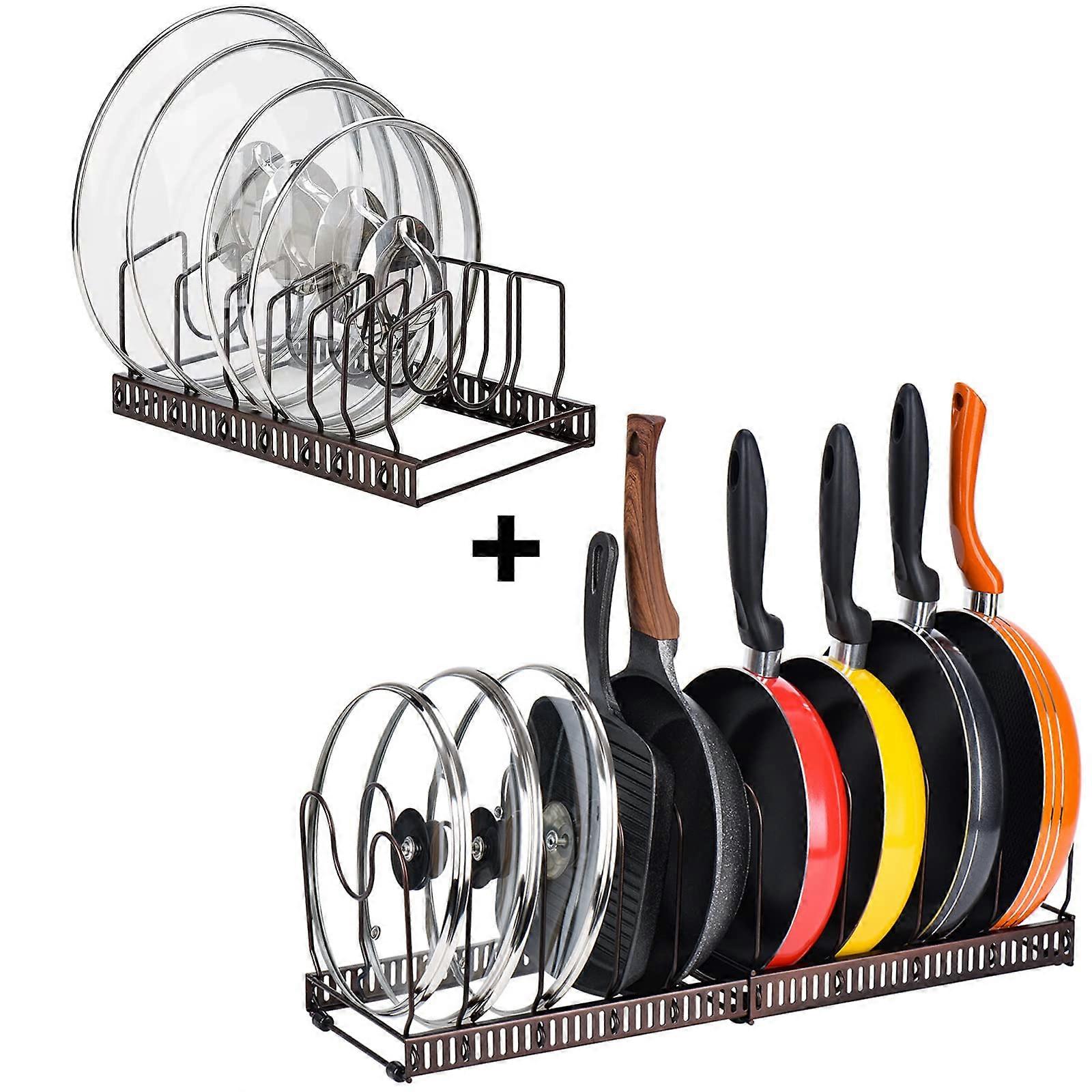 Adjustable Pan and Lid Organizer Rack for Kitchen Cabinet, 10 Slot Cookware Storage, Brown